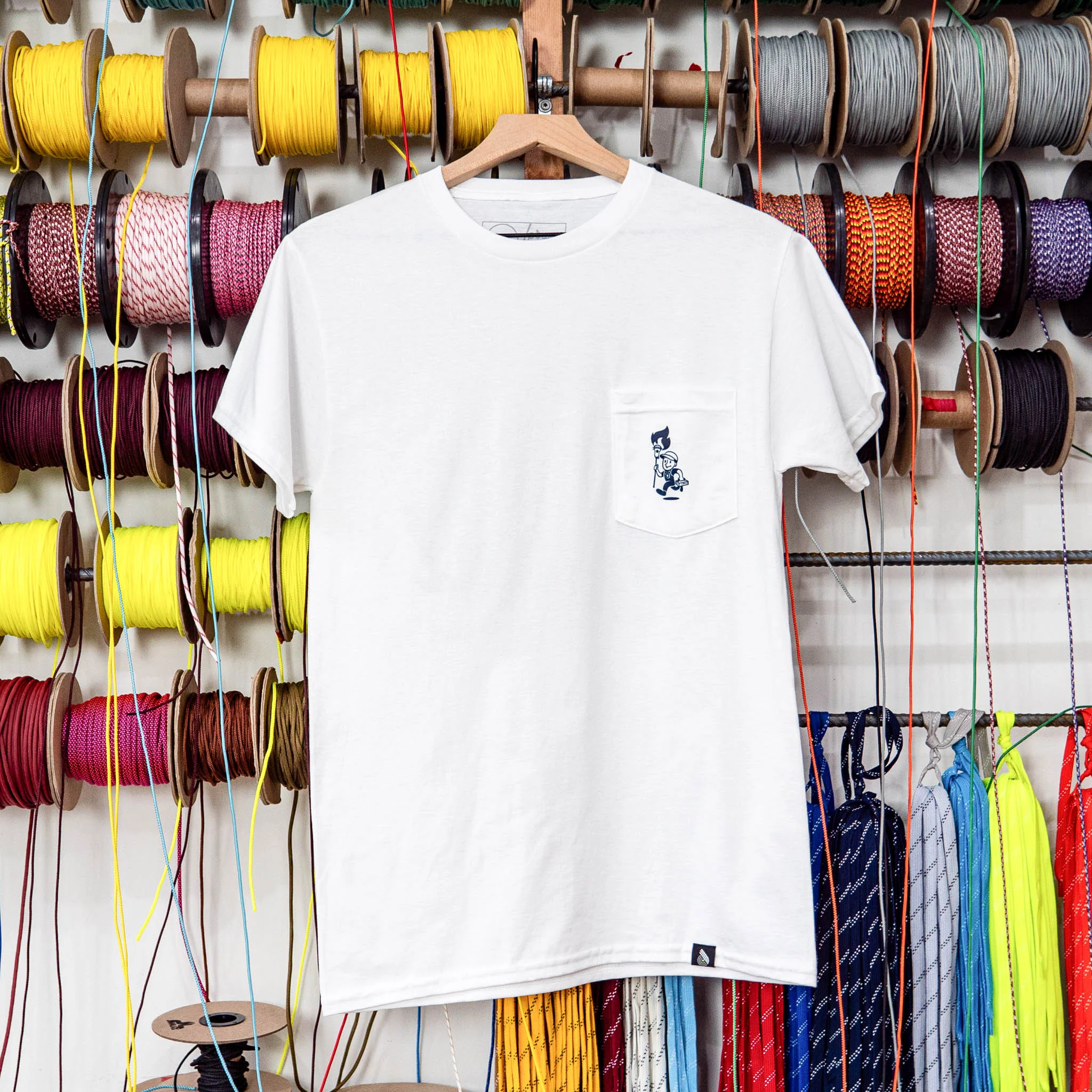 To celebrate our love and dedication to hand stringing we present this classic "pocket" tee featuring our stringing mascot - Bucky. A vintage styled screen print on a ring spun cotton blend retro tee. Â